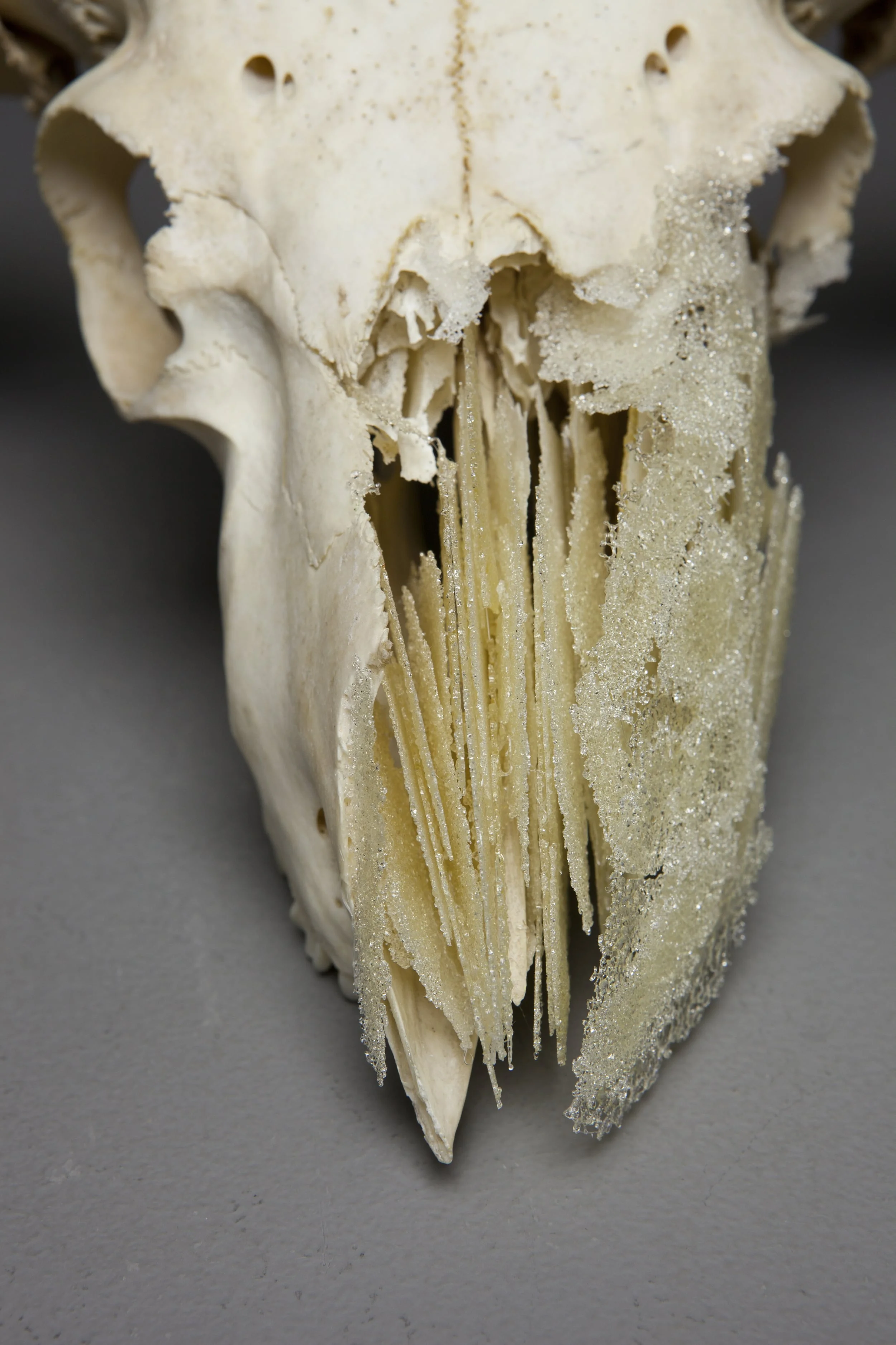 "Ram" was the first of my Mend series. I was inspired by the complex and beautiful texture of bone. The dichotomy of strength and delicacy of each layer begged to be recreated by glass. By using thin layers of fused fit, I emulated the texture and color of bone to meticulously mend the broken Ram skull. Each layer grows from the last, tiny pieces filling the void and making the once incomplete skull full. Mending, by nature, is a human process; we are incapable to accept that the broken is lost forever, and welcome the idea that mending is a process that we can control.
